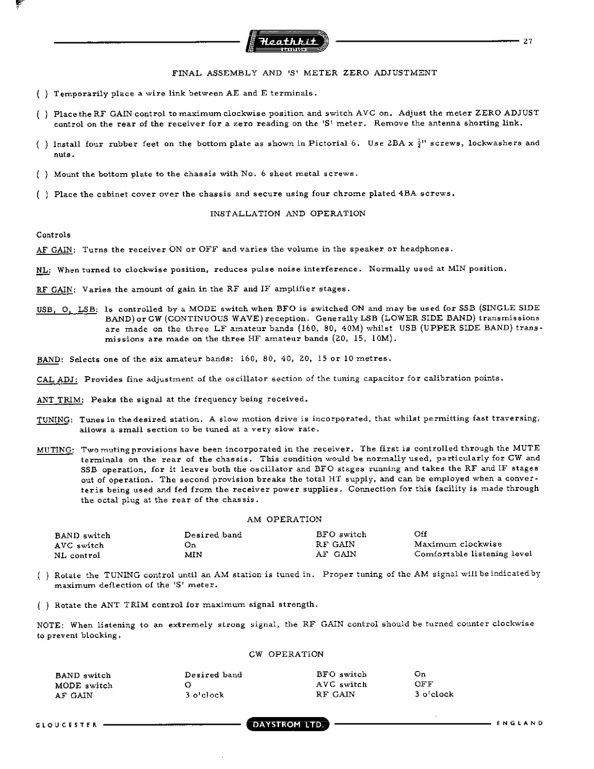 Heathkit RA-1 - Installation and Operation; Front Panel Controls Guide; AM Signal Reception Procedure; CW Signal Reception Procedure
