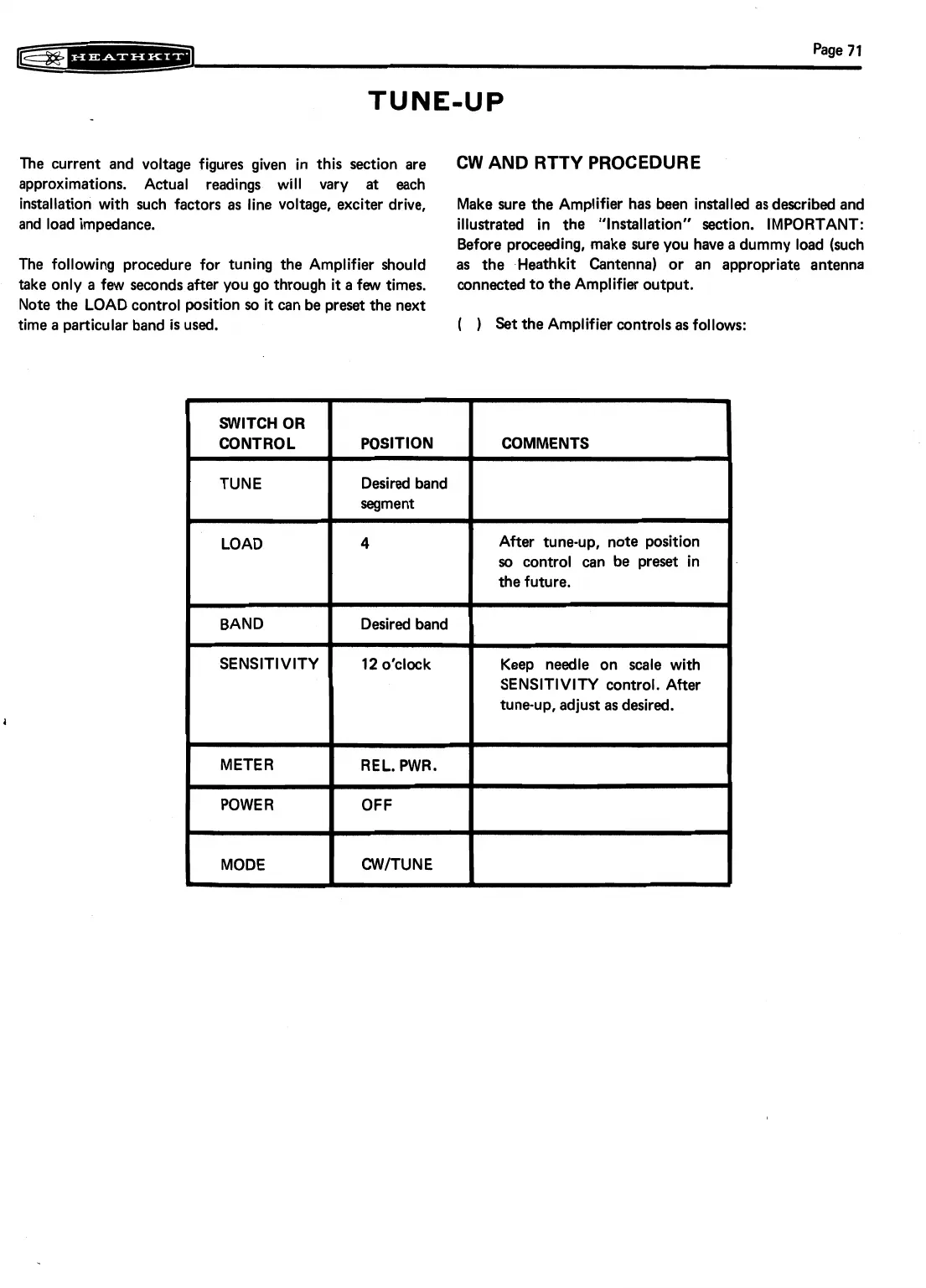 The following procedure for tuning the Amplifier should as the Heathkit Cantenna) or an appropriate antenna