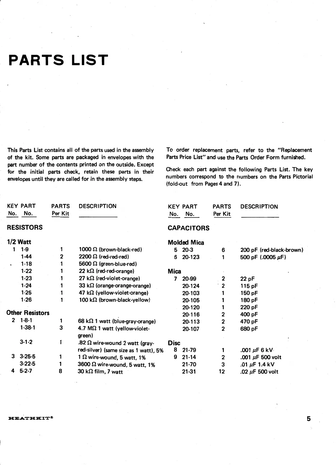 of the kit. Some parts are packaged in envelopes with the Parts Price List" and use the Parts Order Form furnished.