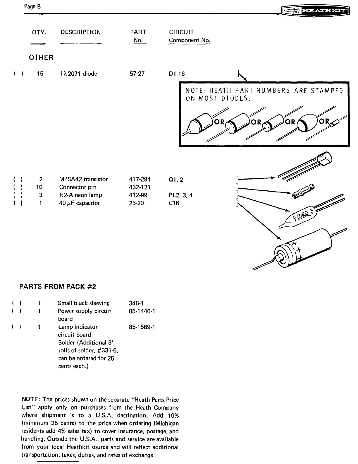 Heathkit SB-230 - Circuit Board Parts List - Pack #1 & #2; Other Components (Pack #1); Pack #2 Components