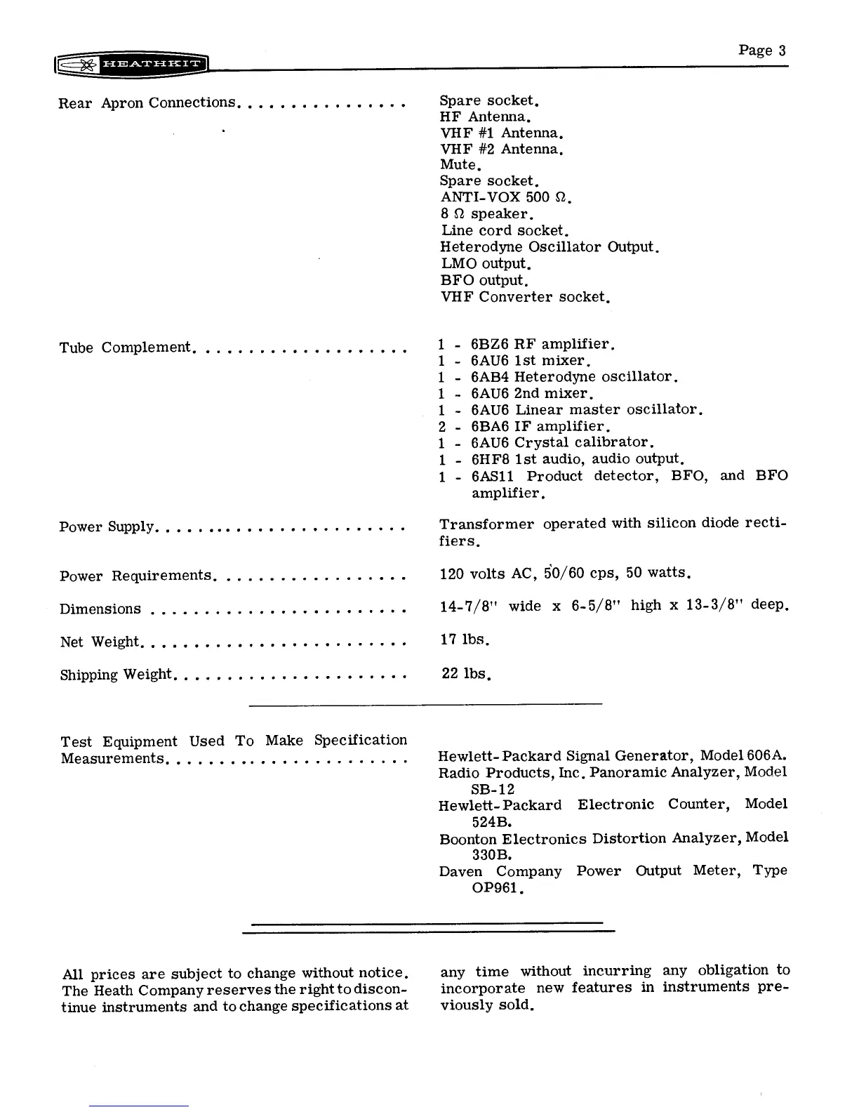 Heathkit SB-300 - Rear Apron Connections; Tube Complement; Power Supply; Power Requirements