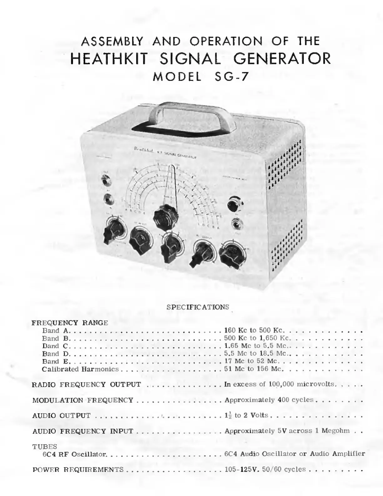 Heathkit SG-7 - Heathkit SG-7 Signal Generator Assembly and Operation; Technical Specifications Overview; Frequency Range Specifications; Radio Frequency Output Level