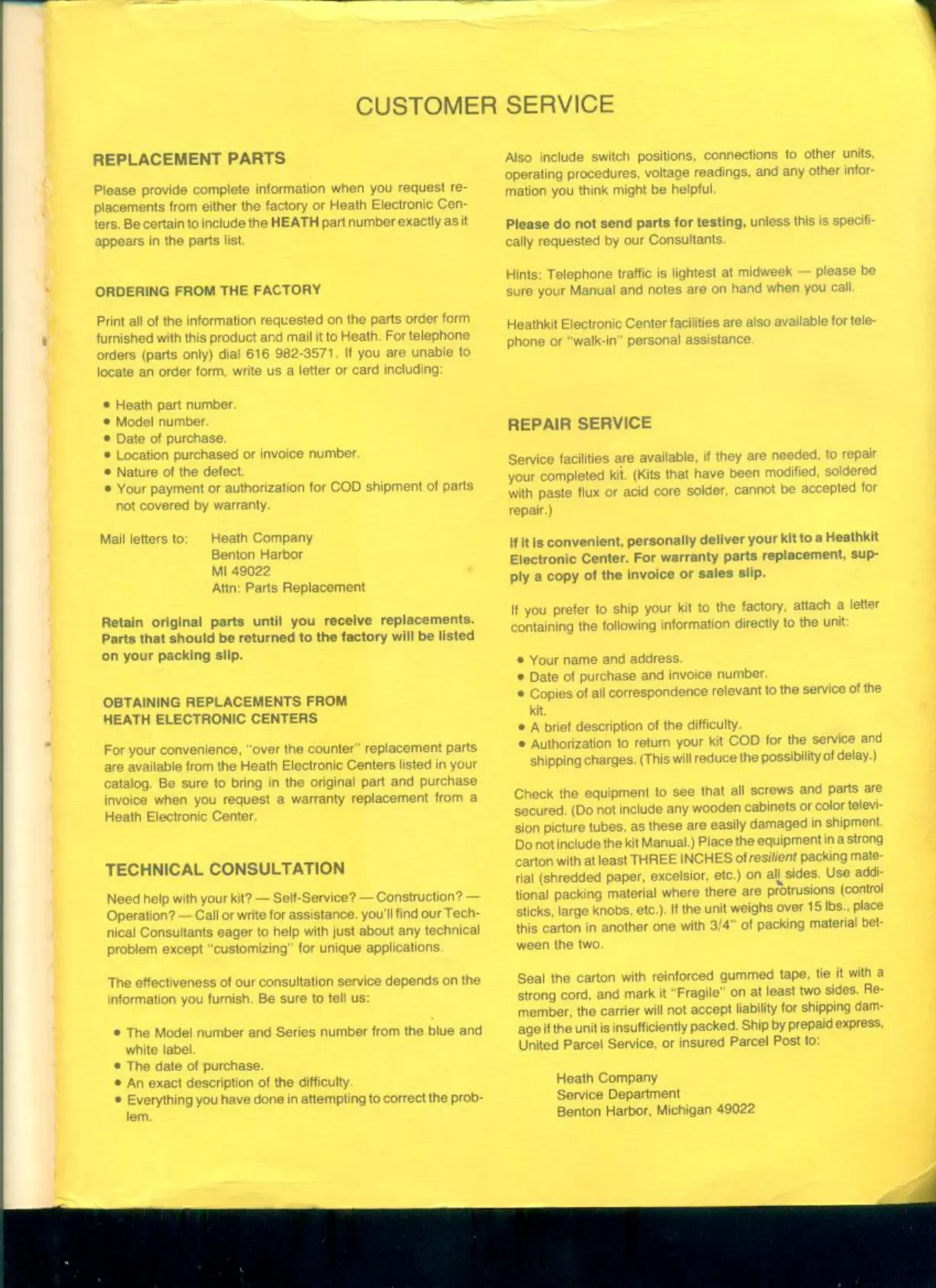 Heathkit SW-7800 - Replacement Parts; Customer Service; Repair Service
