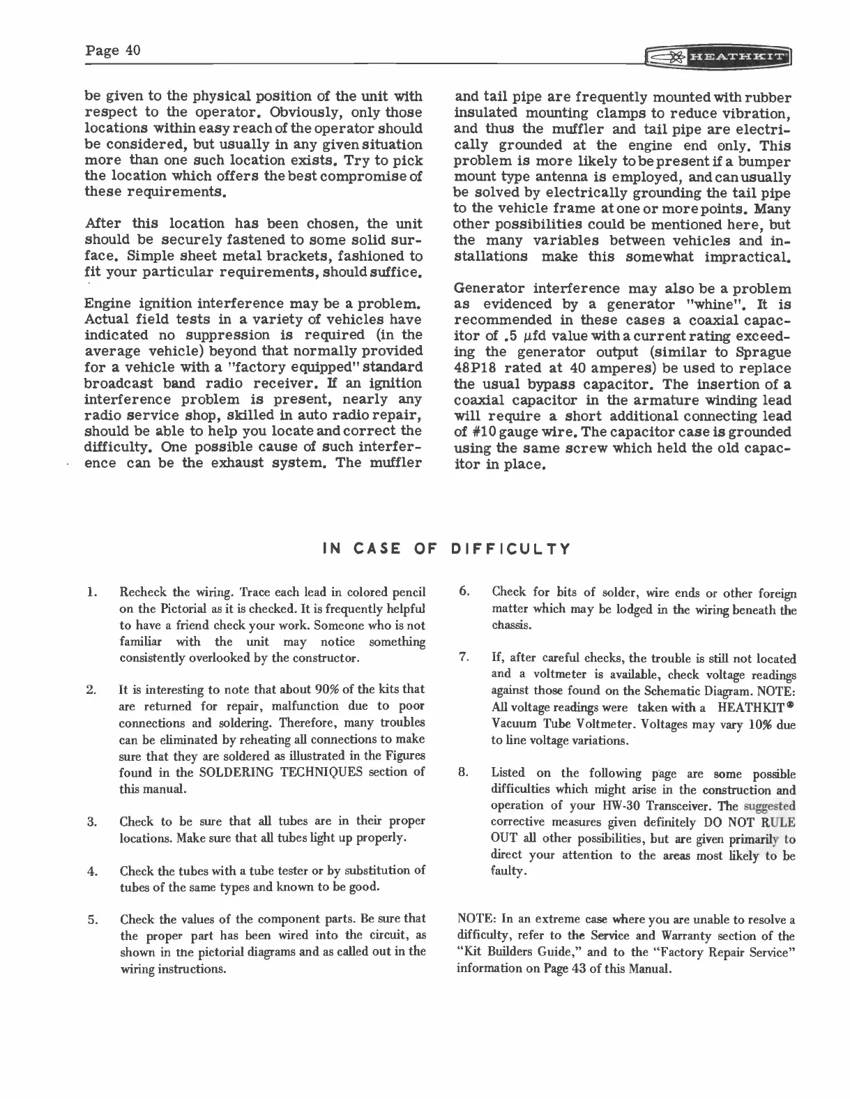 "Kit Builders Guide," and to the "Factory Repair Service"
