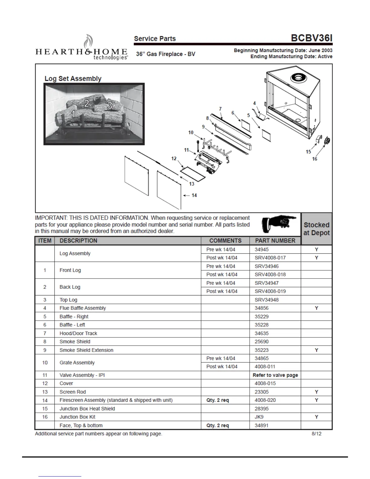 Heatilator BCBV36 - Service Parts List