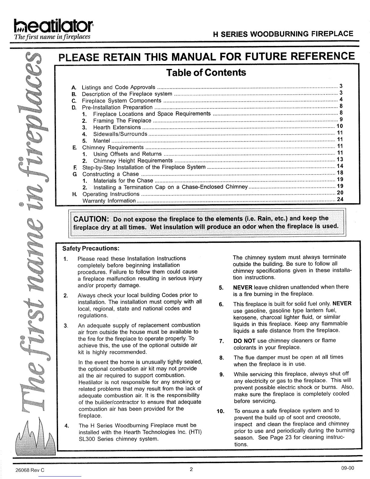 Heatilator HR36 - Table of Contents; Safety Precautions