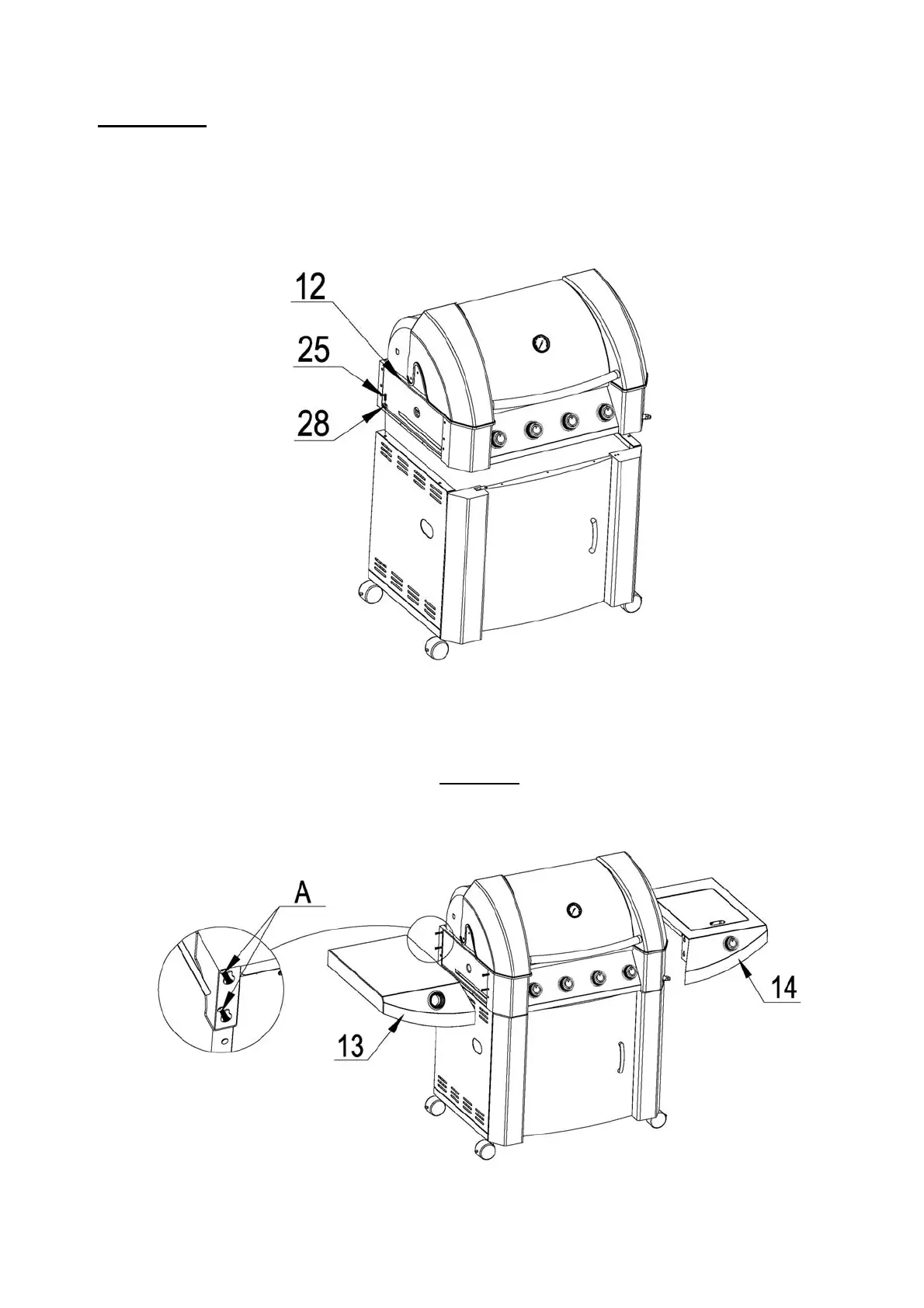 Fix the BBQ frame (No.12) to the trolley with 4×M6×12 screws (No.25) and 4× Fibre