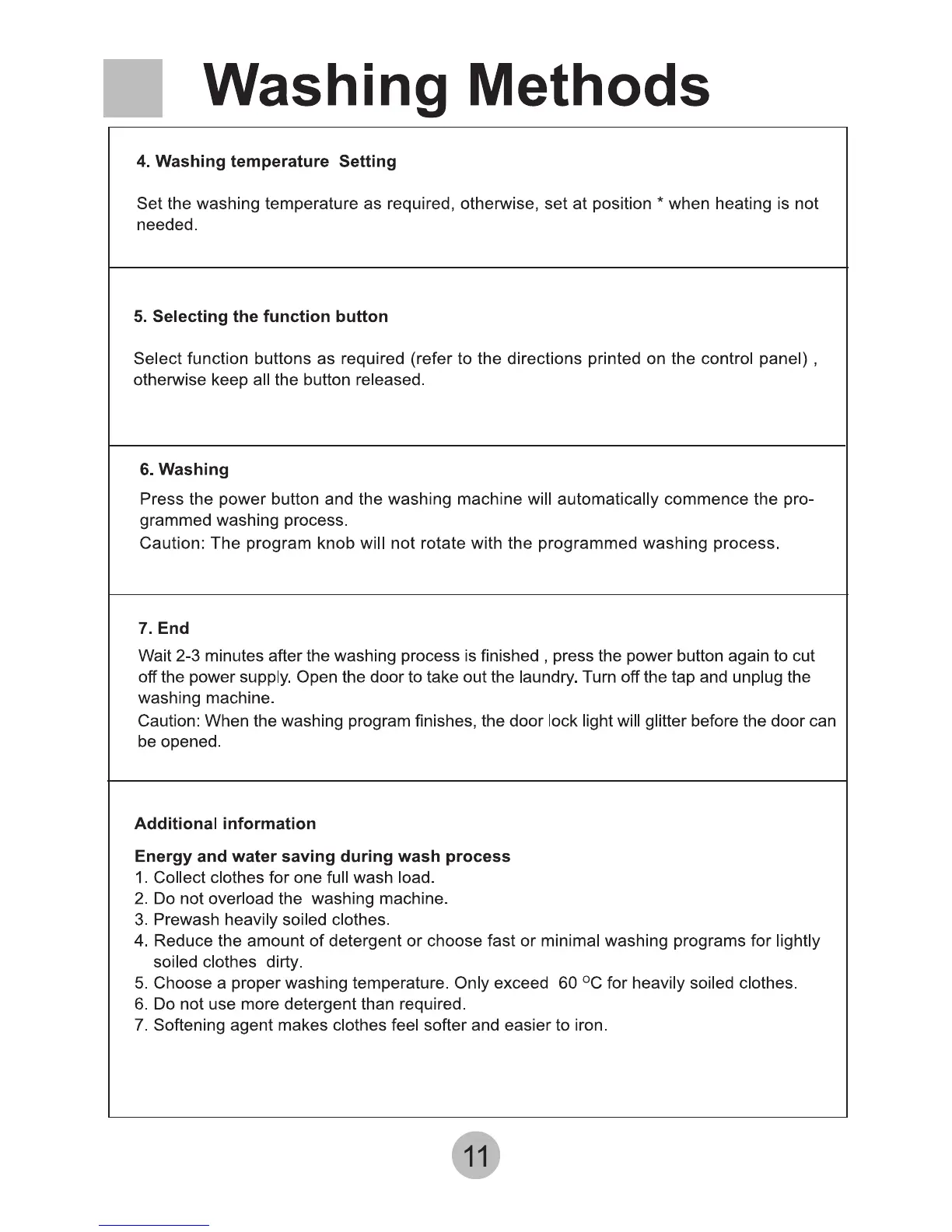 HEC HEC1050S - Washing Methods; Washing Temperature Setting; Function Button Selection; Washing Process