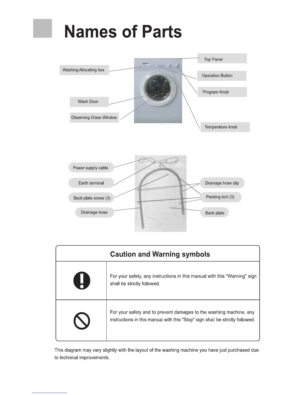 HEC HEC1050S - Names of Parts; Caution and Warning Symbols