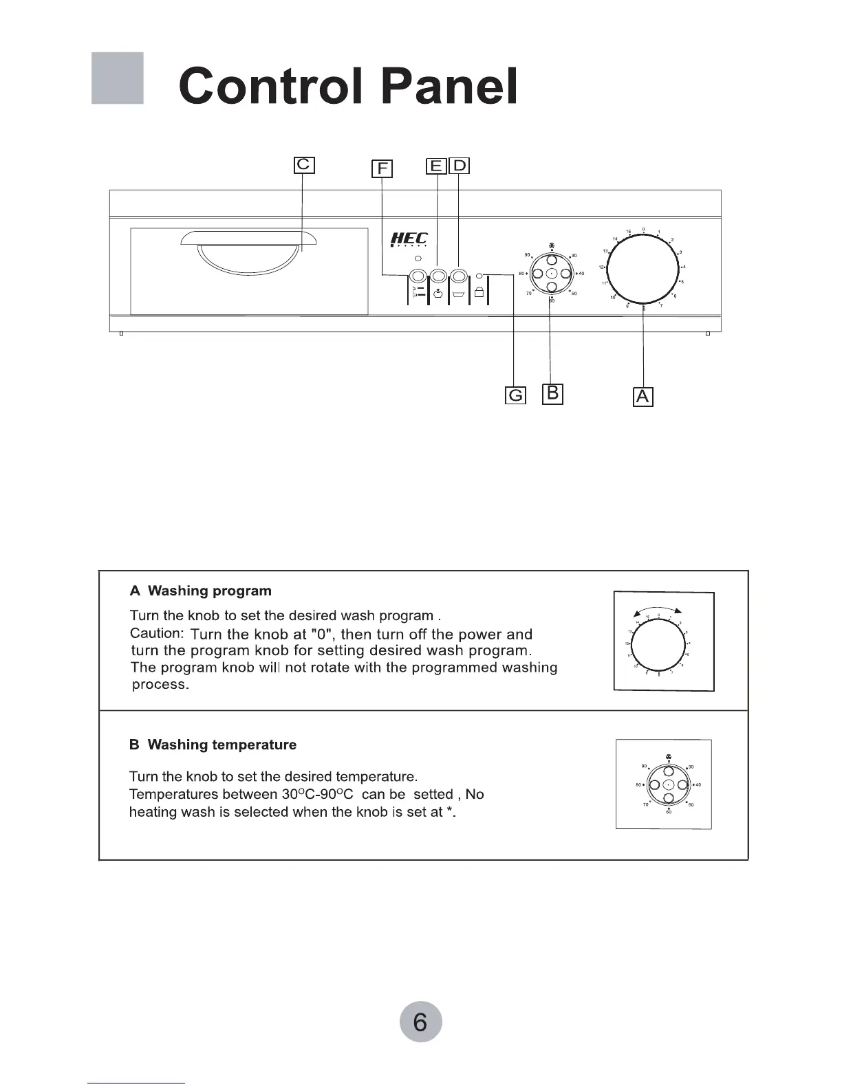 HEC HEC1050S - Control Panel; Washing Program Selection; Washing Temperature Setting