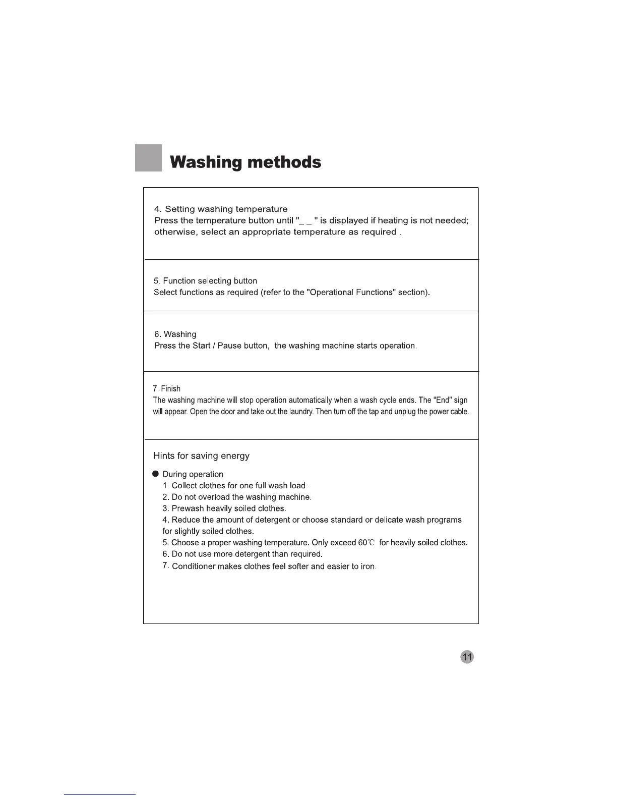 HEC MWH100E - Selecting Washing Temperature;Function; Washing; Finish of Washing; Hints for Saving Energy