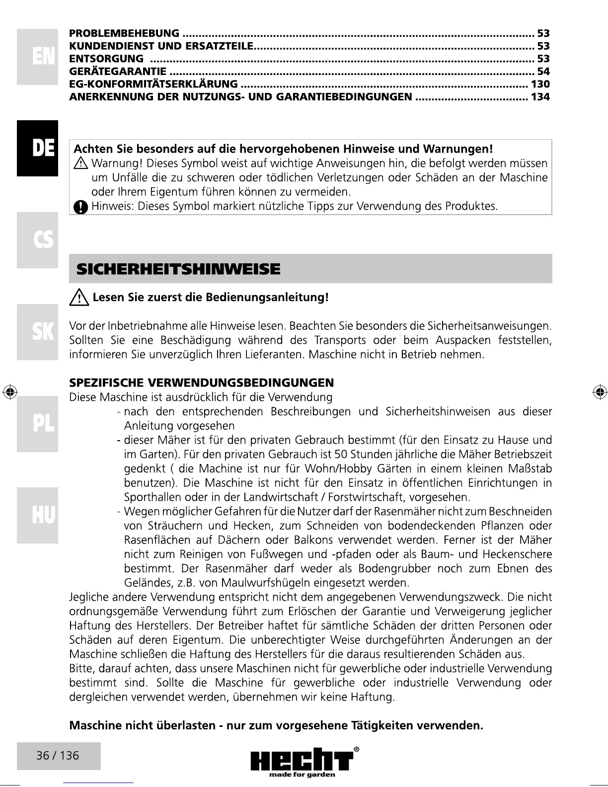 hecht 1803 S - SAFETY INSTRUCTIONS; SPECIFIC CONDITIONS OF USE