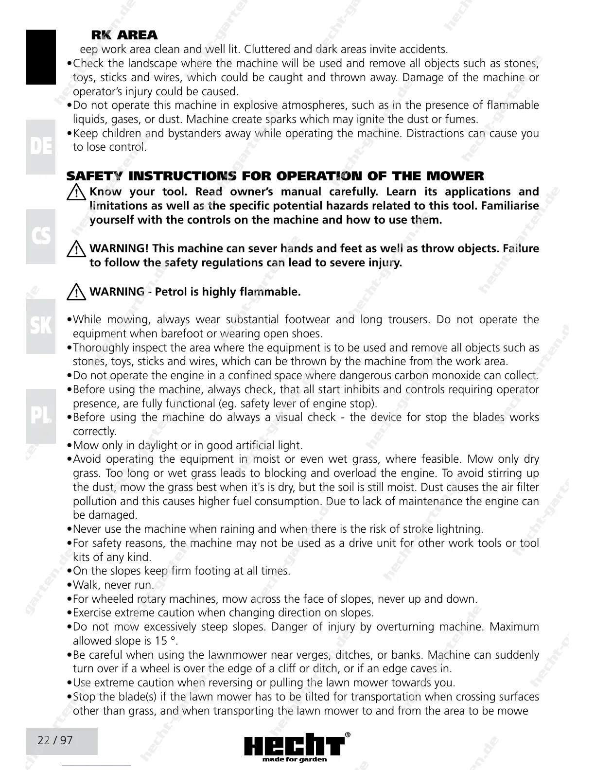 SAFETY INSTRUCTIONS FOR OPERATION OF THE MOWER