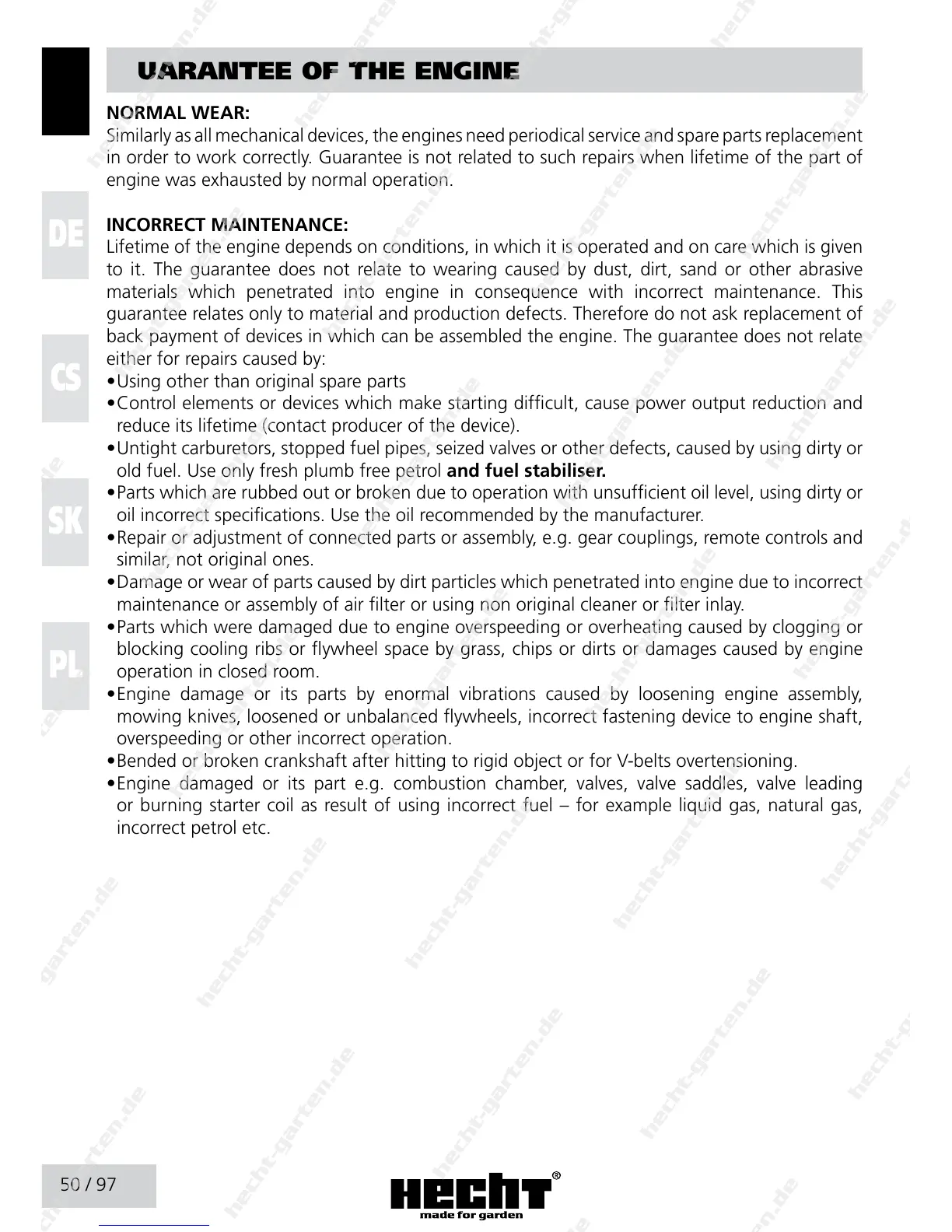 to it. The guarantee does not relate to wearing caused by dust, dirt, sand or other abrasive