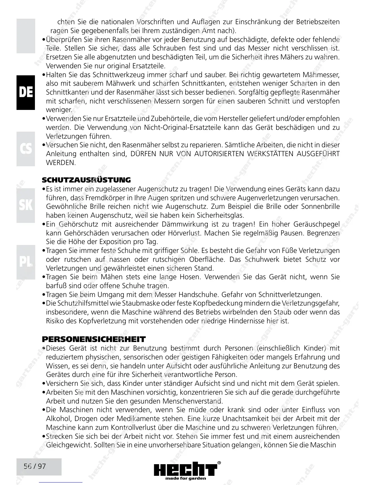 • Versuchen Sie nicht, den Rasenmäher selbst zu reparieren. Sämtliche Arbeiten, die nicht in dieser