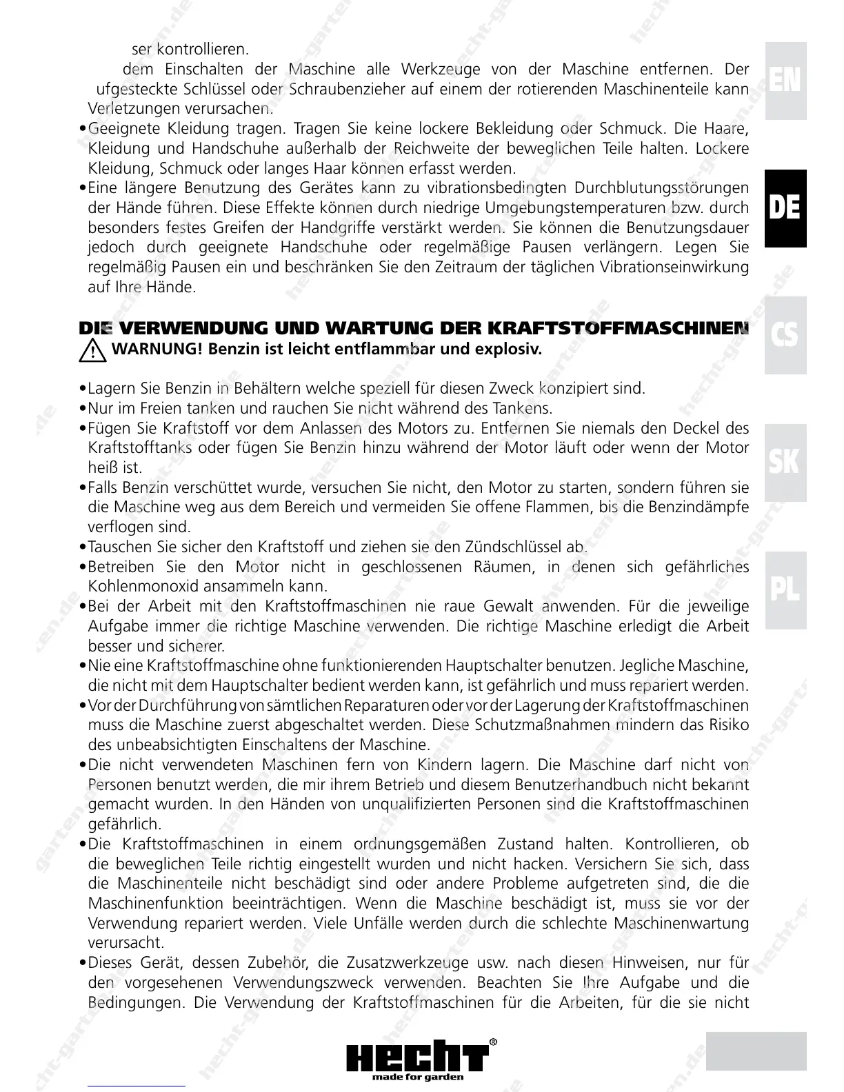 • Bei der Arbeit mit den Kraftstoffmaschinen nie raue Gewalt anwenden. Für die jeweilige