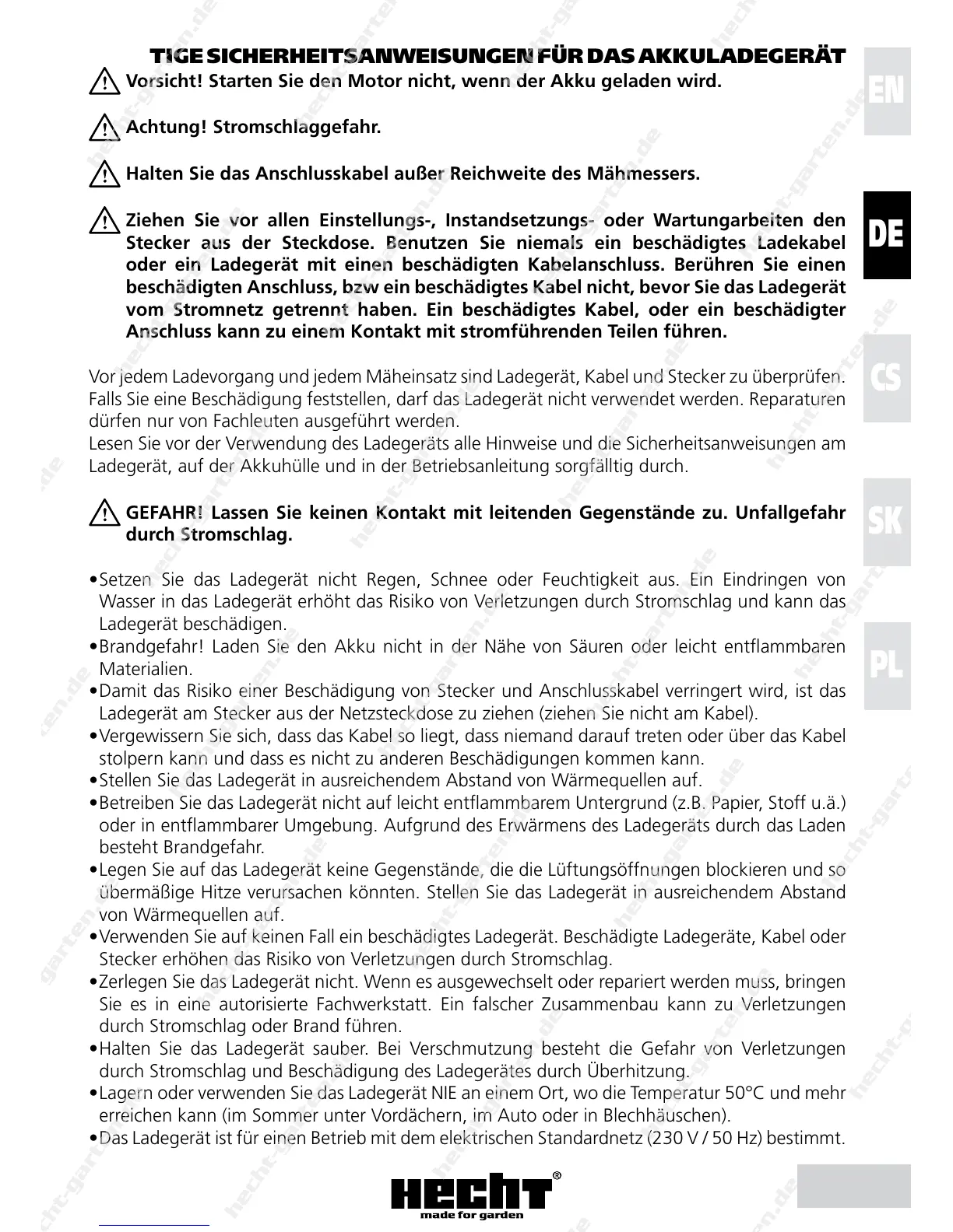 • Das Ladegerät ist für einen Betrieb mit dem elektrischen Standardnetz (230 V / 50 Hz) bestimmt.