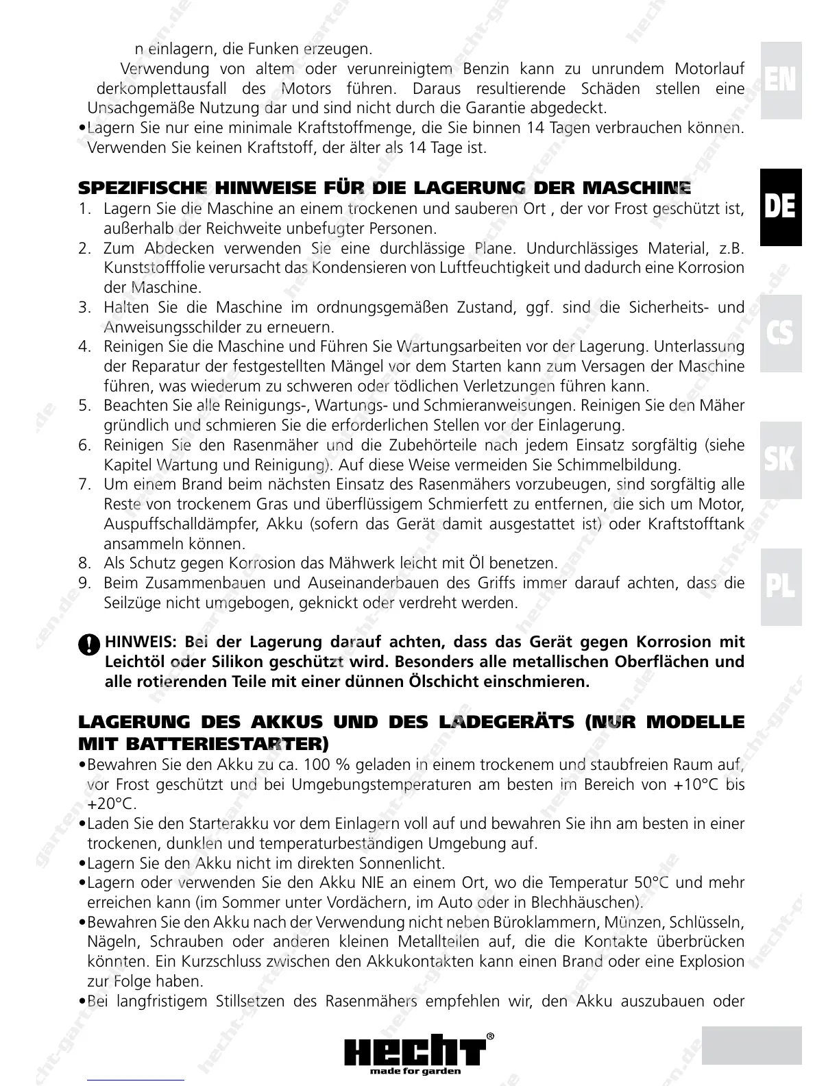 • Bei langfristigem Stillsetzen des Rasenmähers empfehlen wir, den Akku auszubauen oder