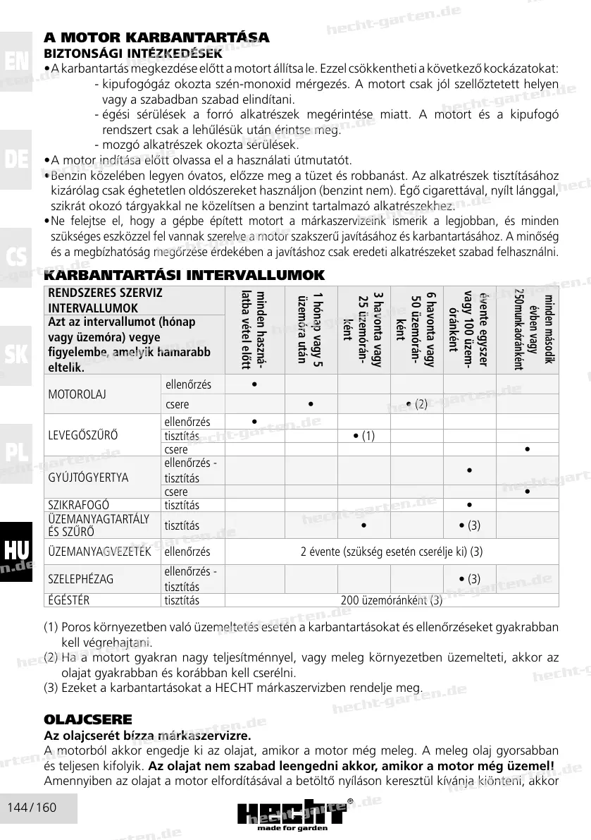 (3) Ezeket a karbantartásokat a HECHT márkaszervizben rendelje meg.