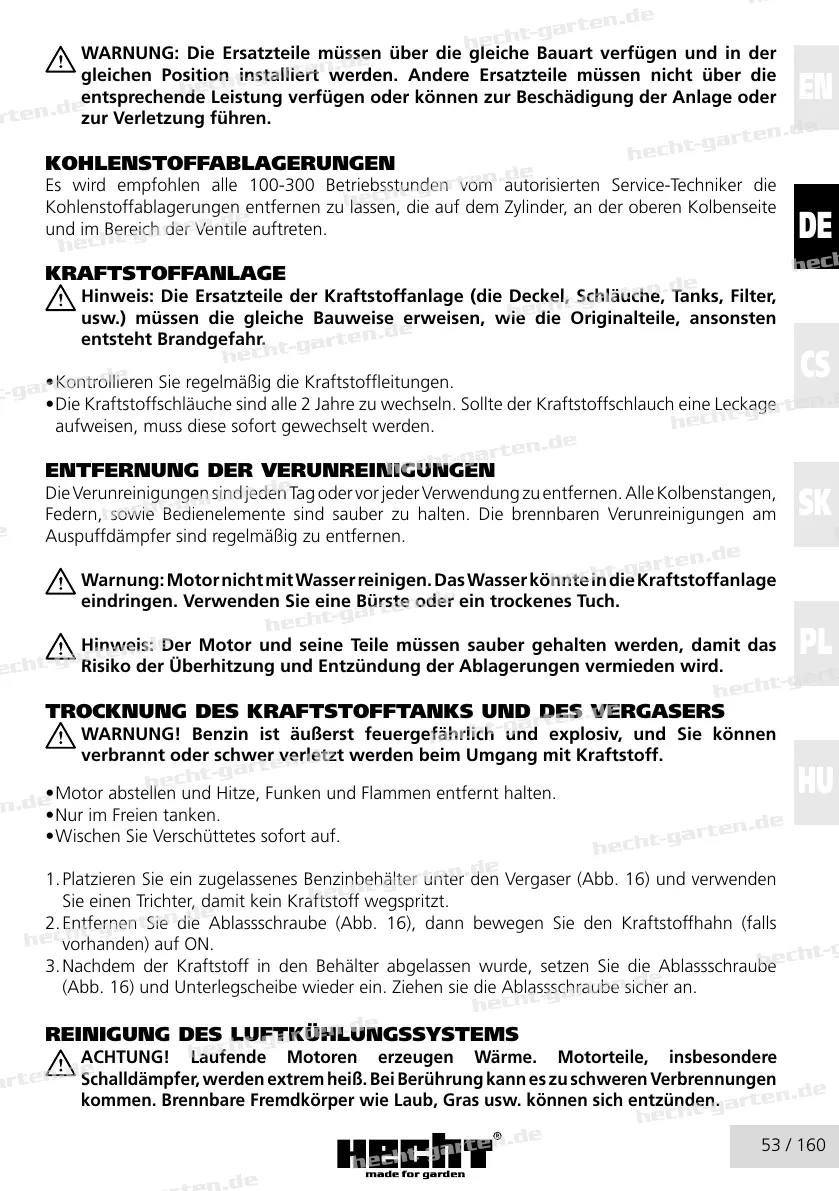 Warnung: Motor nicht mit Wasser reinigen. Das Wasser könnte in die Kraftstoffanlage