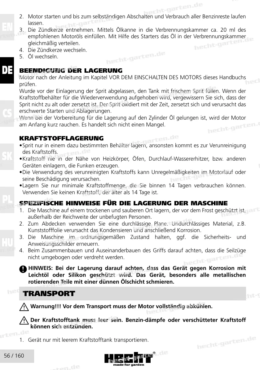Warnung!!! Vor dem Transport muss der Motor vollständig abkühlen.