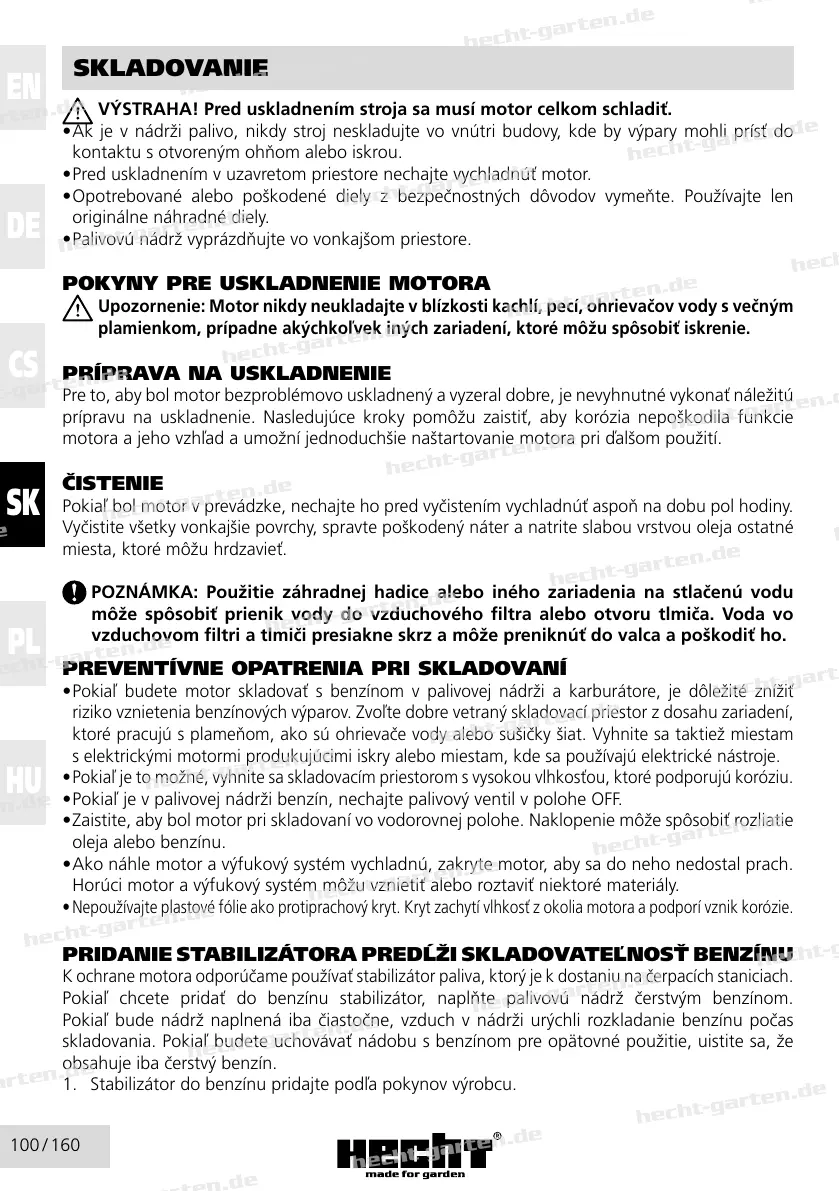 VÝSTRAHA! Pred uskladnením stroja sa musí motor celkom schladiť.