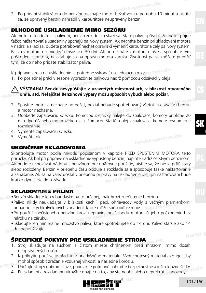 • Palivo nikdy neukladajte v blízkosti kachlí, pecí, ohrievačov vody s večným plamienkom,