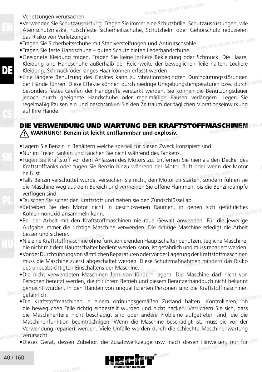 • Bei der Arbeit mit den Kraftstoffmaschinen nie raue Gewalt anwenden. Für die jeweilige