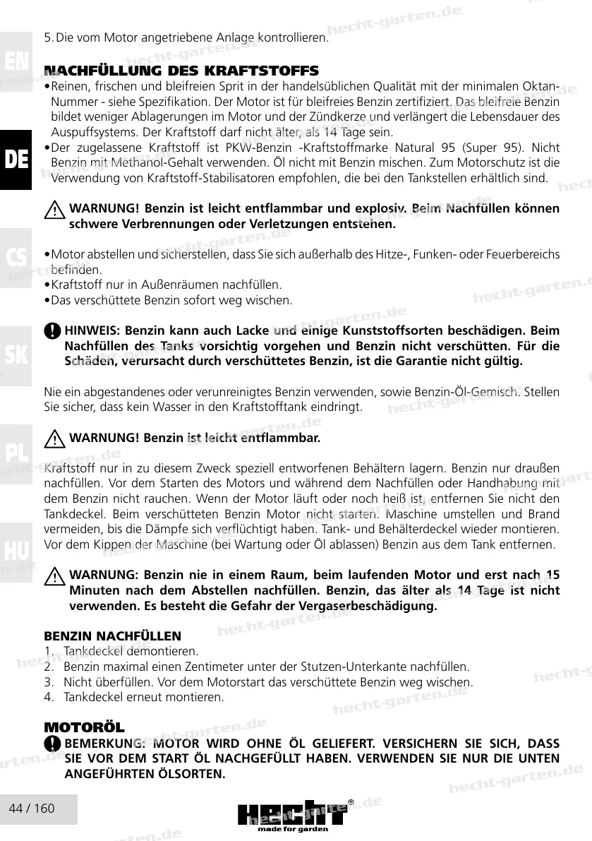WARNUNG: Benzin nie in einem Raum, beim laufenden Motor und erst nach 15