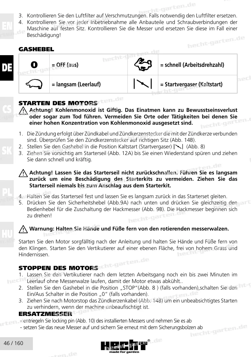 Starten Sie den Motor sorgfälltig nach der Anleitung und halten Sie Hände und Füße fern von