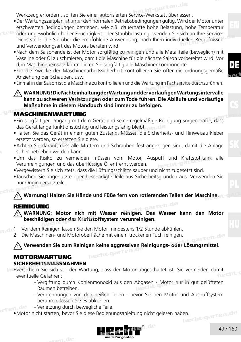 • Nach dem Saisonende ist der Motor sorgfältig zu reinigen und alle Metallteile (beweglich) mit