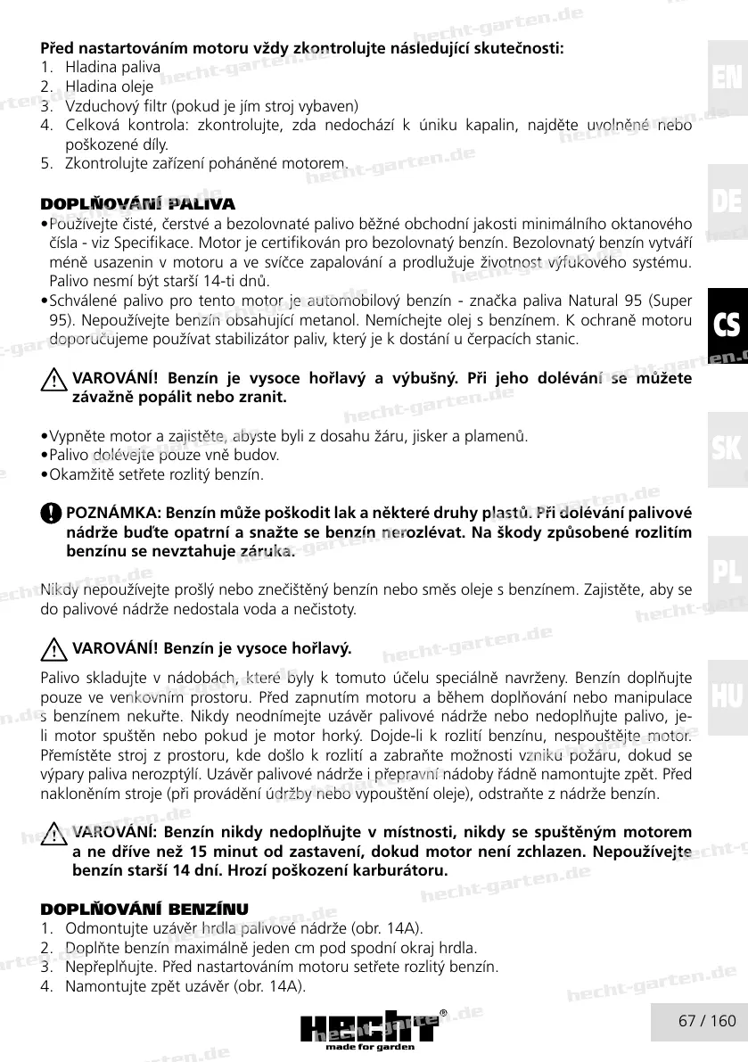 95). Nepoužívejte benzín obsahující metanol. Nemíchejte olej s benzínem. K ochraně motoru