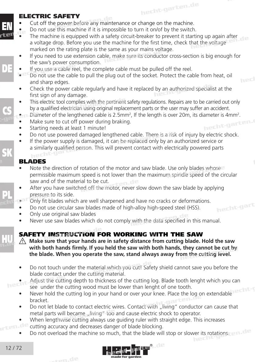 • Do not let blade to contact electric wires. Contact with „living“ conductor can cause that