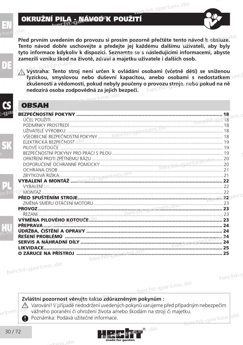 BEZPEČNOSTNÍ POKYNY PRO PRÁCI S PILOU ...................................................................................... 19