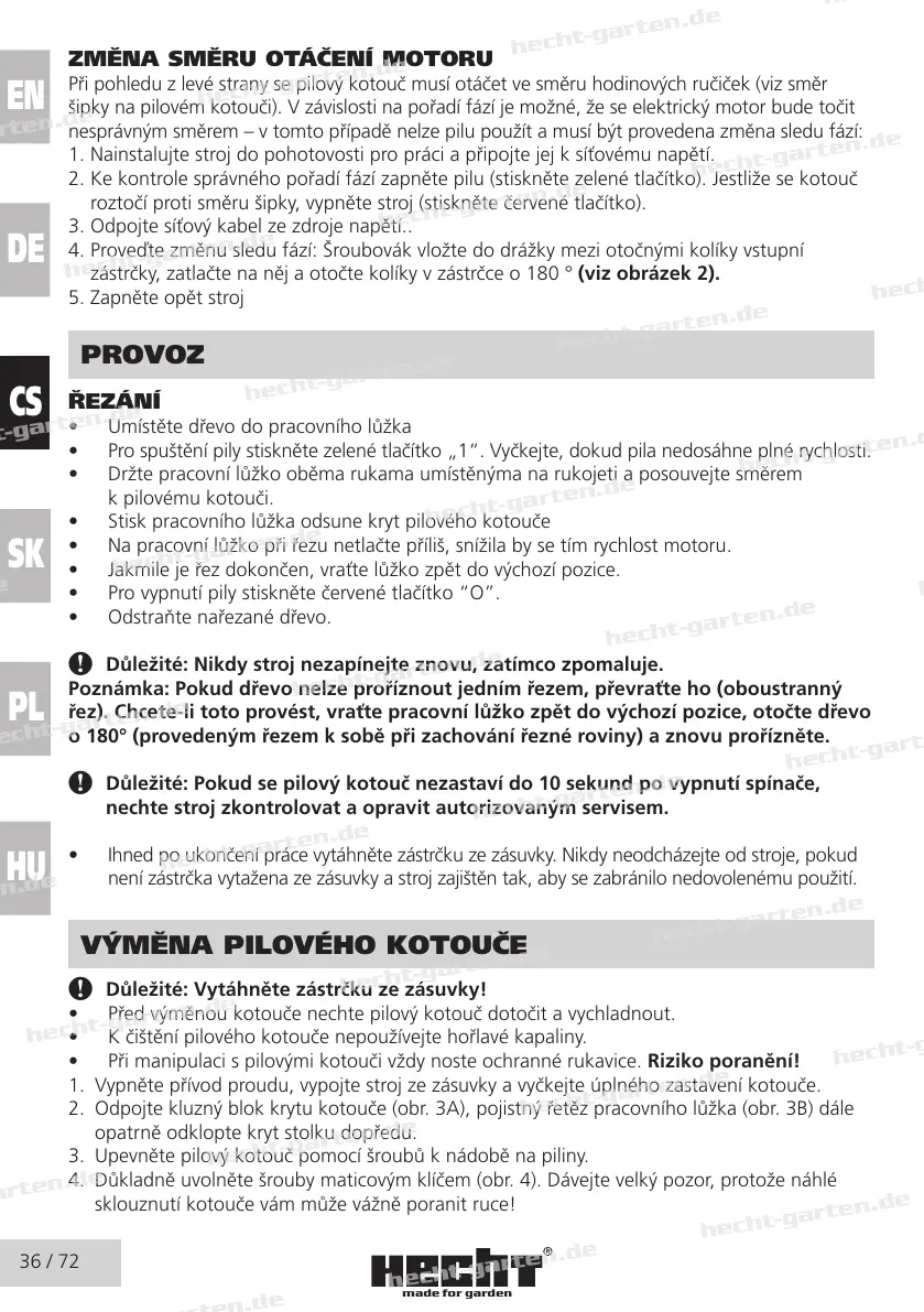 • Při manipulaci s pilovými kotouči vždy noste ochranné rukavice. Riziko poranění!