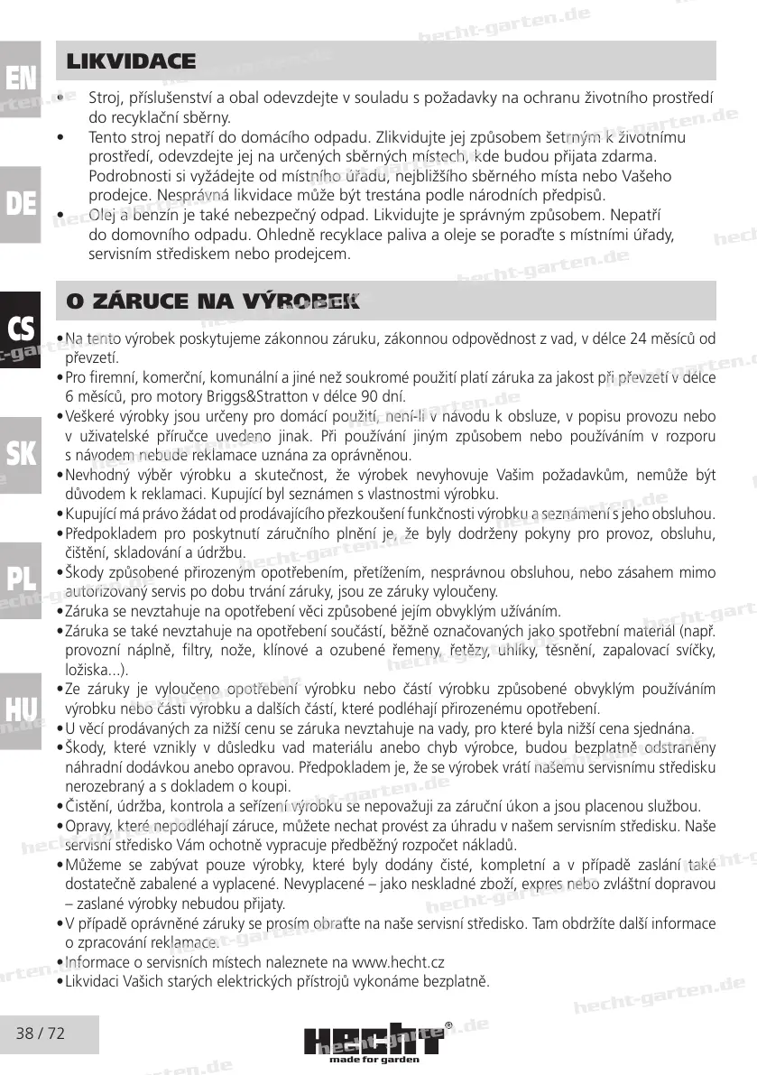 • Čistění, údržba, kontrola a seřízení výrobku se nepovažuji za záruční úkon a jsou placenou službou.