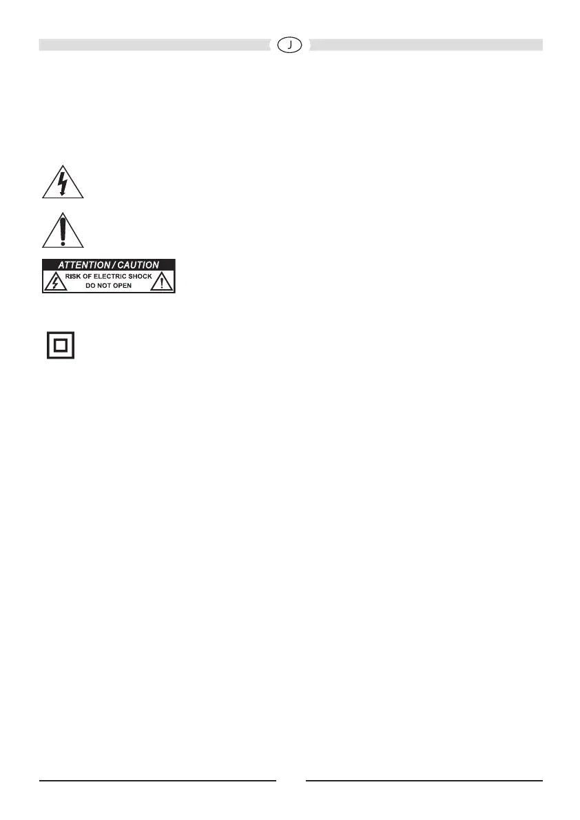 稲妻の記載された三角マークは、装置が高圧を使用しており、危険な感電原因となる こと