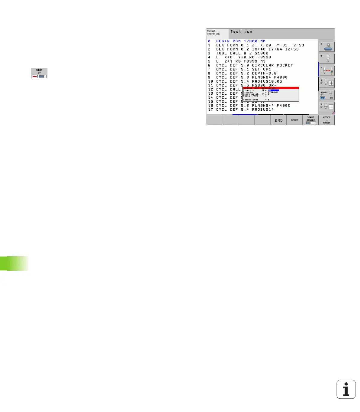 With the STOP AT N function the TNC does a test run only up to the