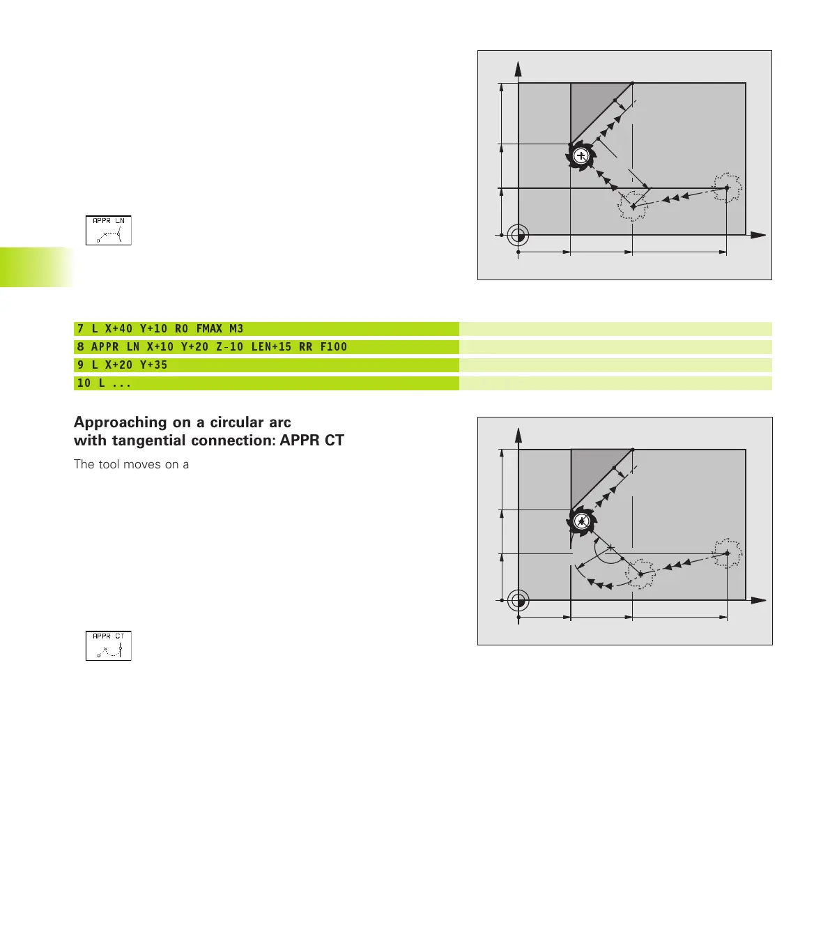 8 APPR LN X+10 Y+20 Z-10 LEN+15 RR F100