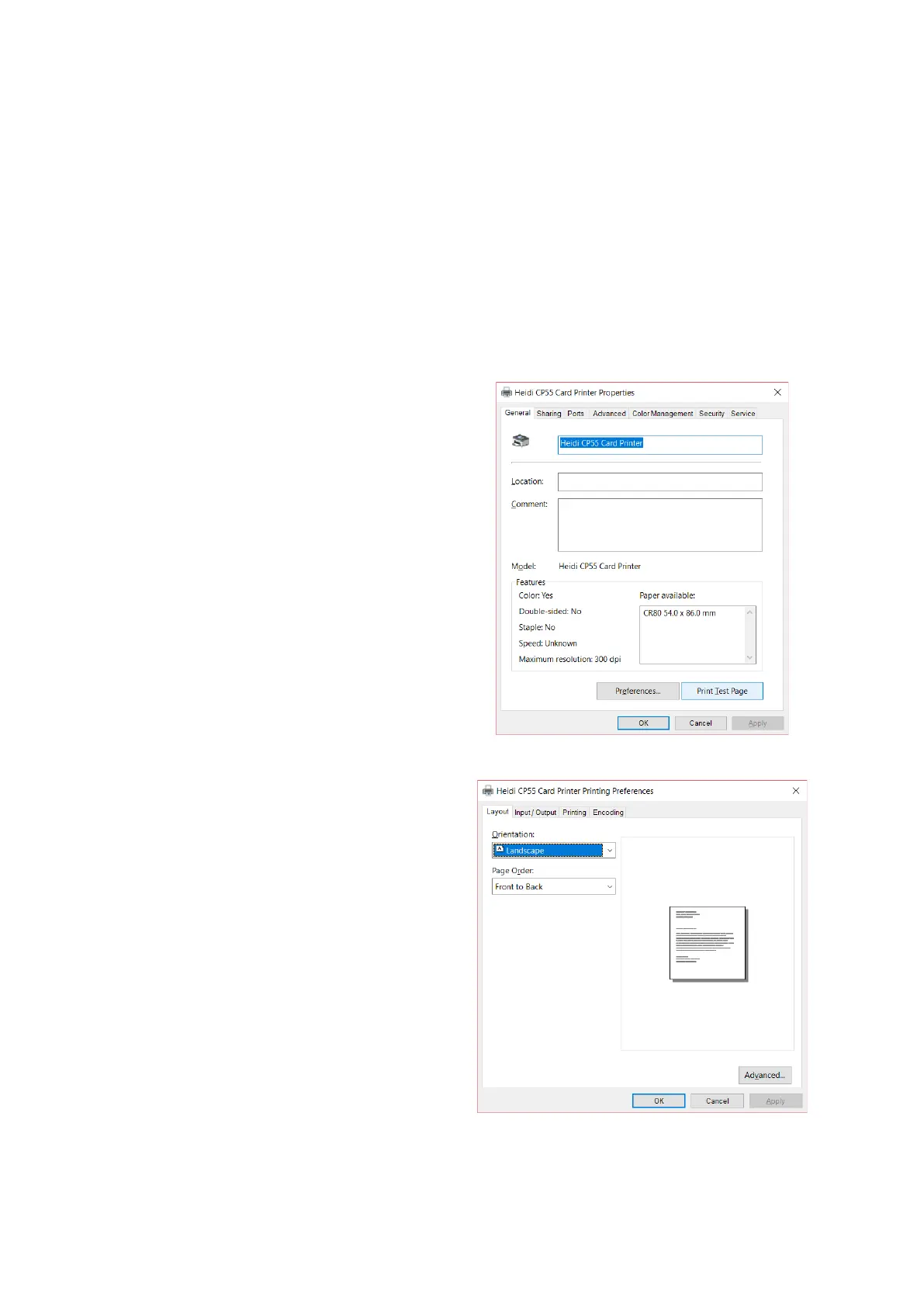 “Devices and Printers” and right-click “Heidi CP55 Card Printer”.