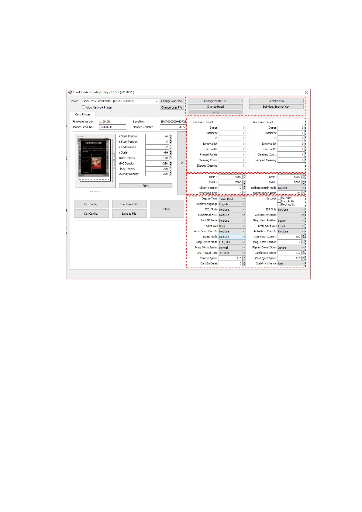 ① You can set Printer ID, PC serial, Print head and Magnetic encryption key.