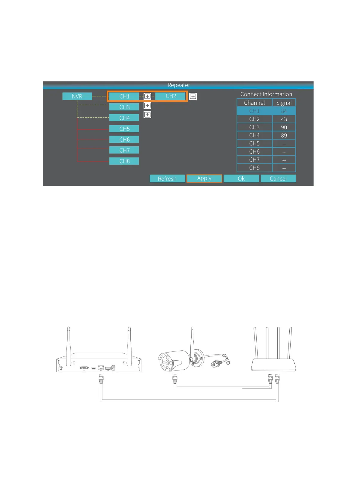 Klikněte za CH1/IPCAM1, poté vyberte 2 a nastavte IPCAM1 jako opakovač. To znamená,