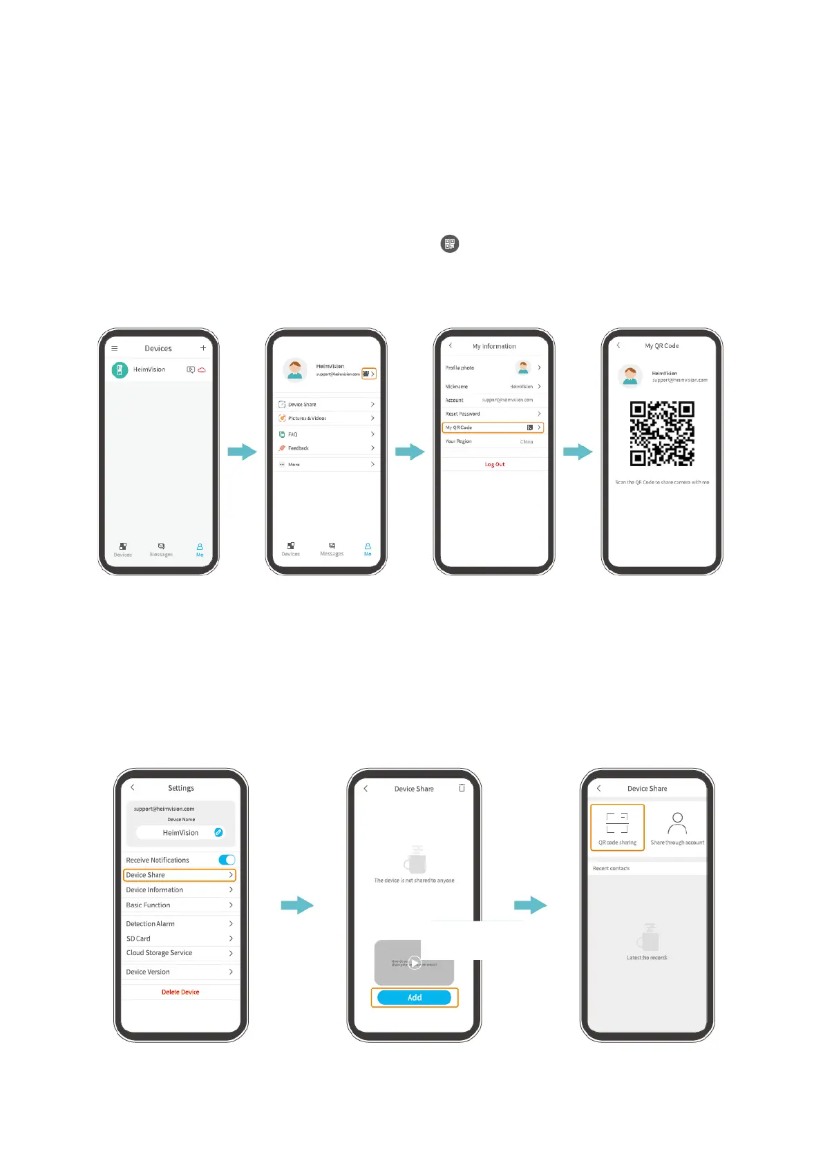 zařízení (Device Share)> Přidat (Add)> Sdílení QR kódu (QR code sharing) a naskenujte