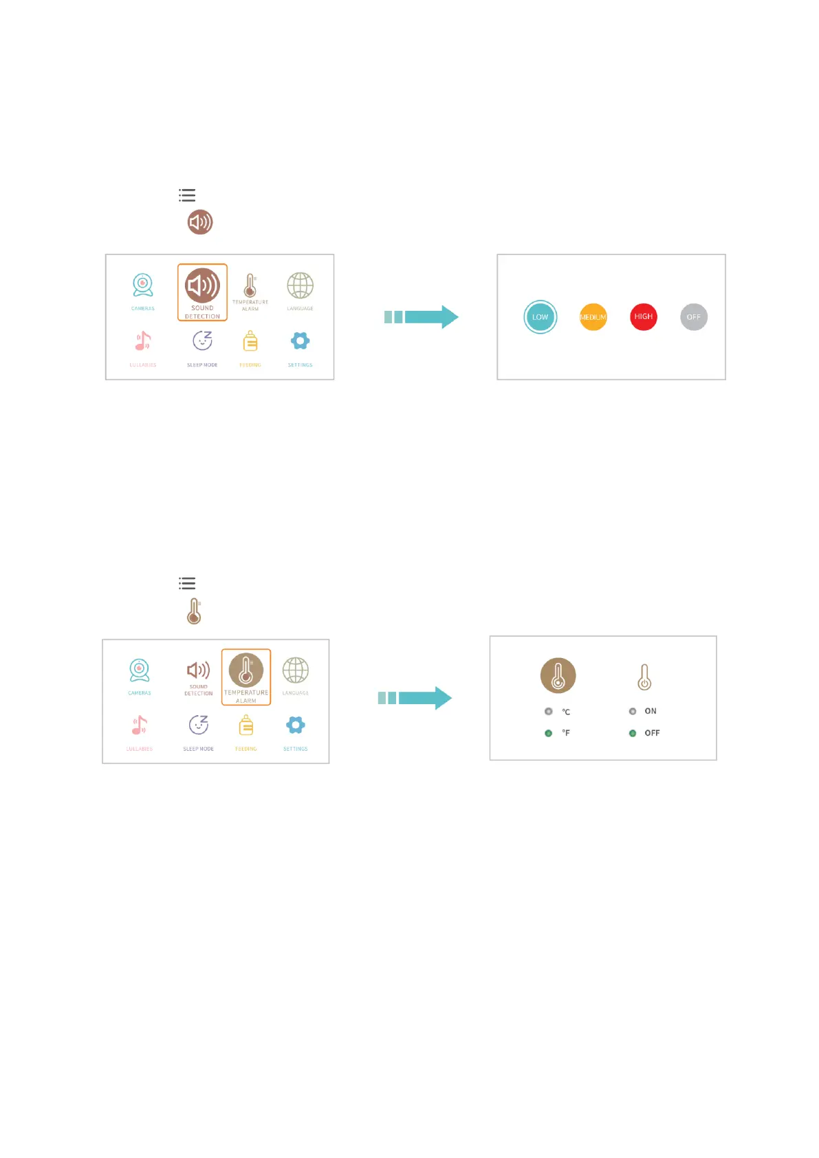 ● Výberom možnosti VYPNÚŤ deaktivujete detekciu zvuku. Zvoľte NÍZKE na príjem