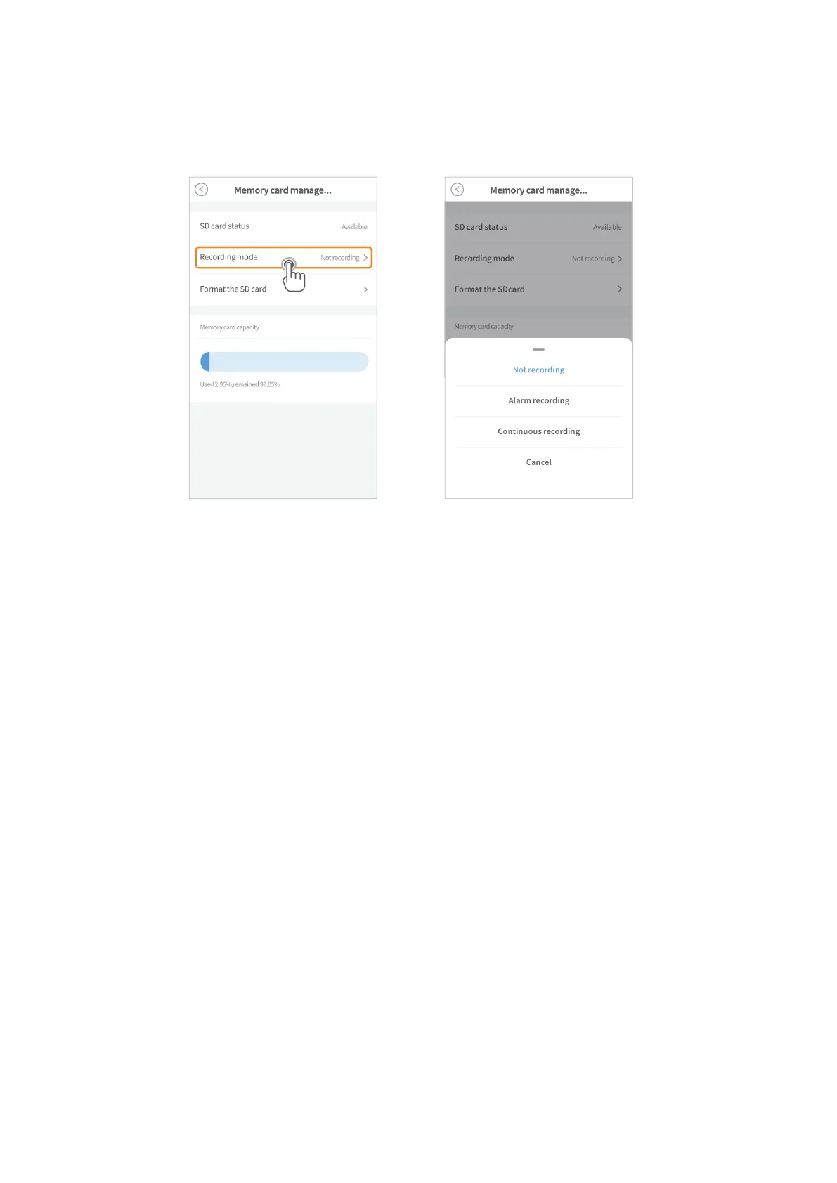 Ezután válassza ki a felvételi módot a Nincs felvétel, a Riasztás rögzítése és a Folyamatos