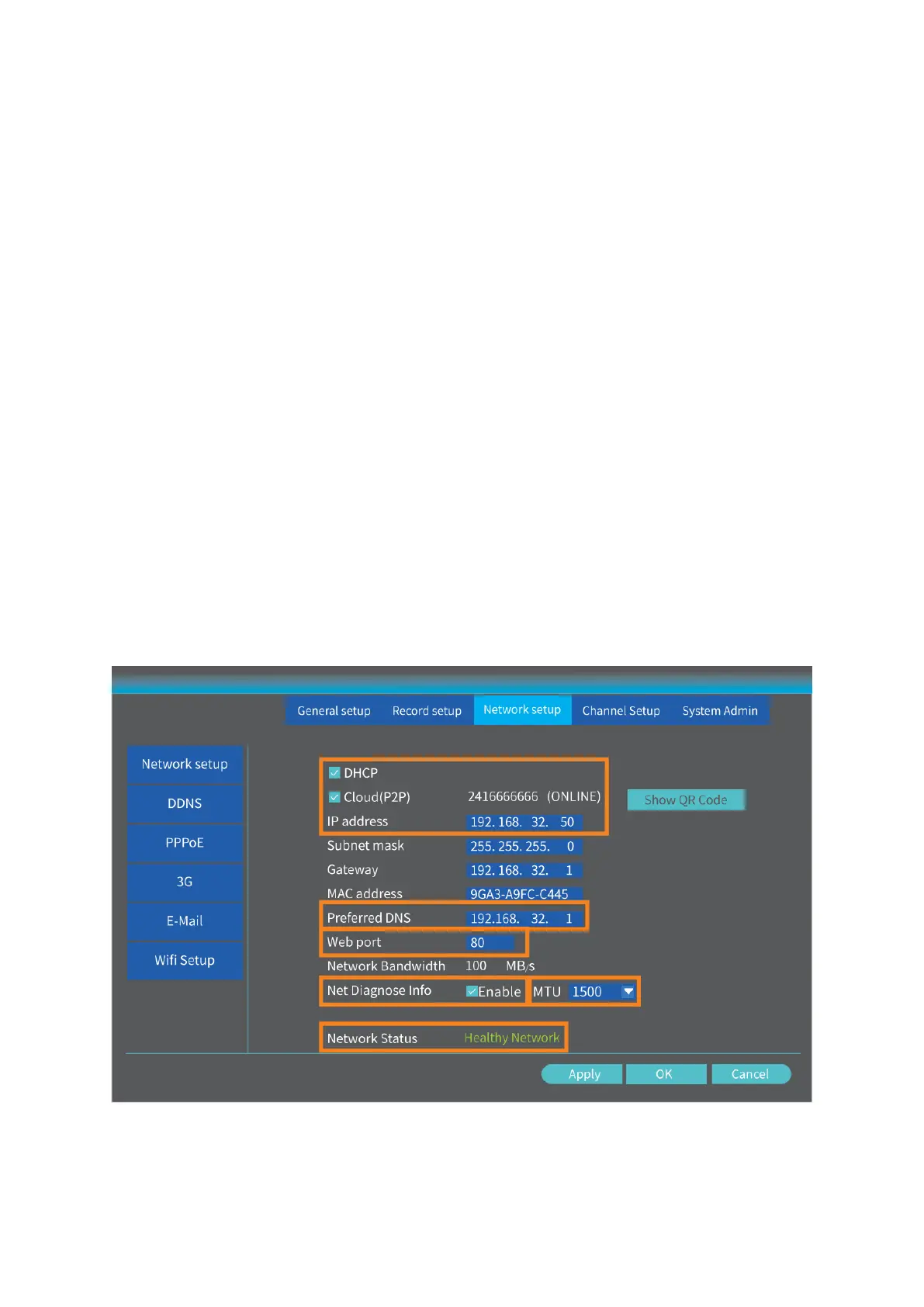 • Ellenőrizze, hogy be van-e jelölve a DHCP, a Felhő (P2P) és az Engedélyezés a