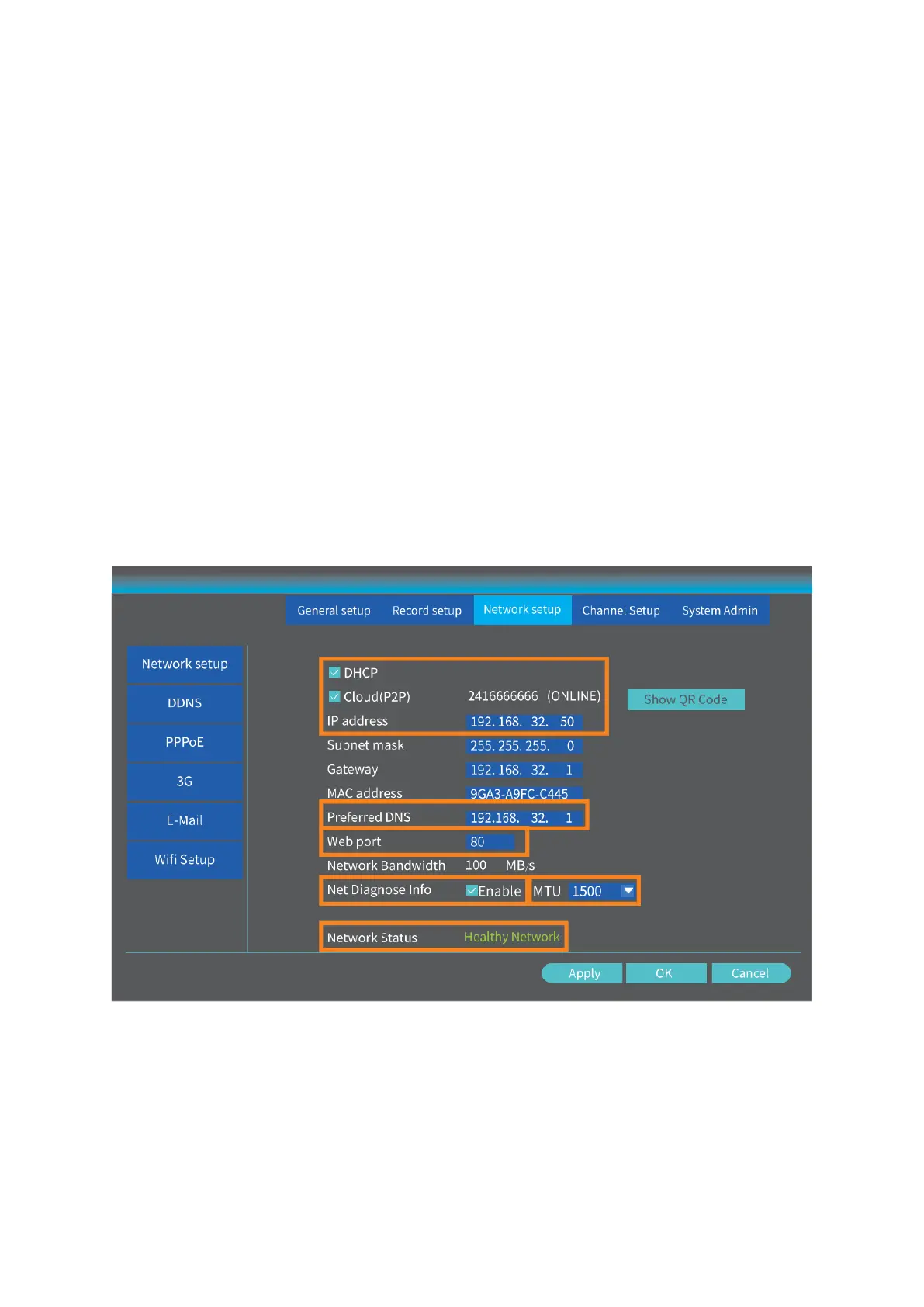 • Make sure the DHCP, Cloud (P2P) and Enable following the Net Diagnose Info are
