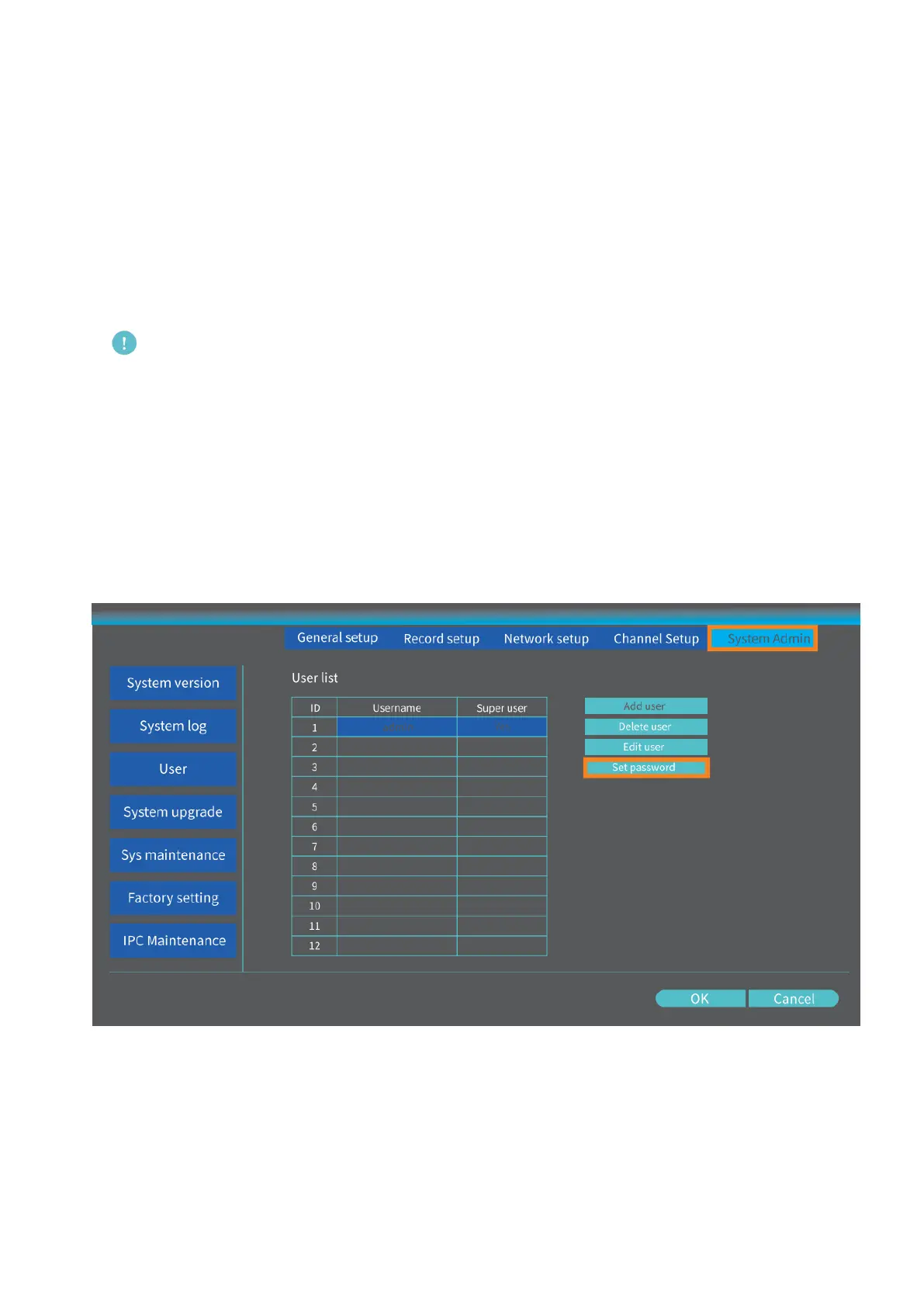 (System setup)> Správce systému (System admin)> Uživatel (Admin)> Nastavit