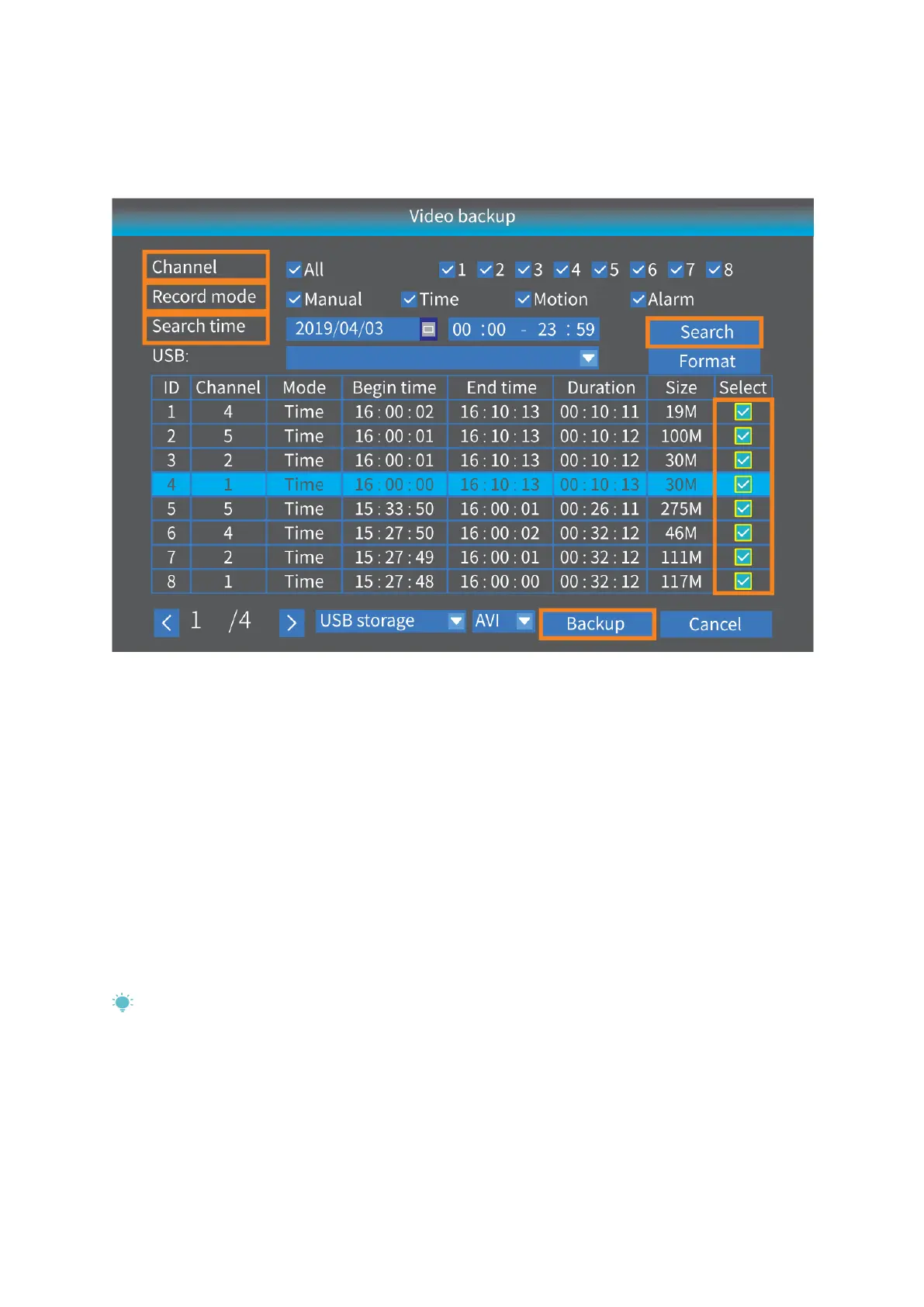 Vyberte kanál (Channel), režim záznamu (Record Mode) a čas hľadania (Search time) a