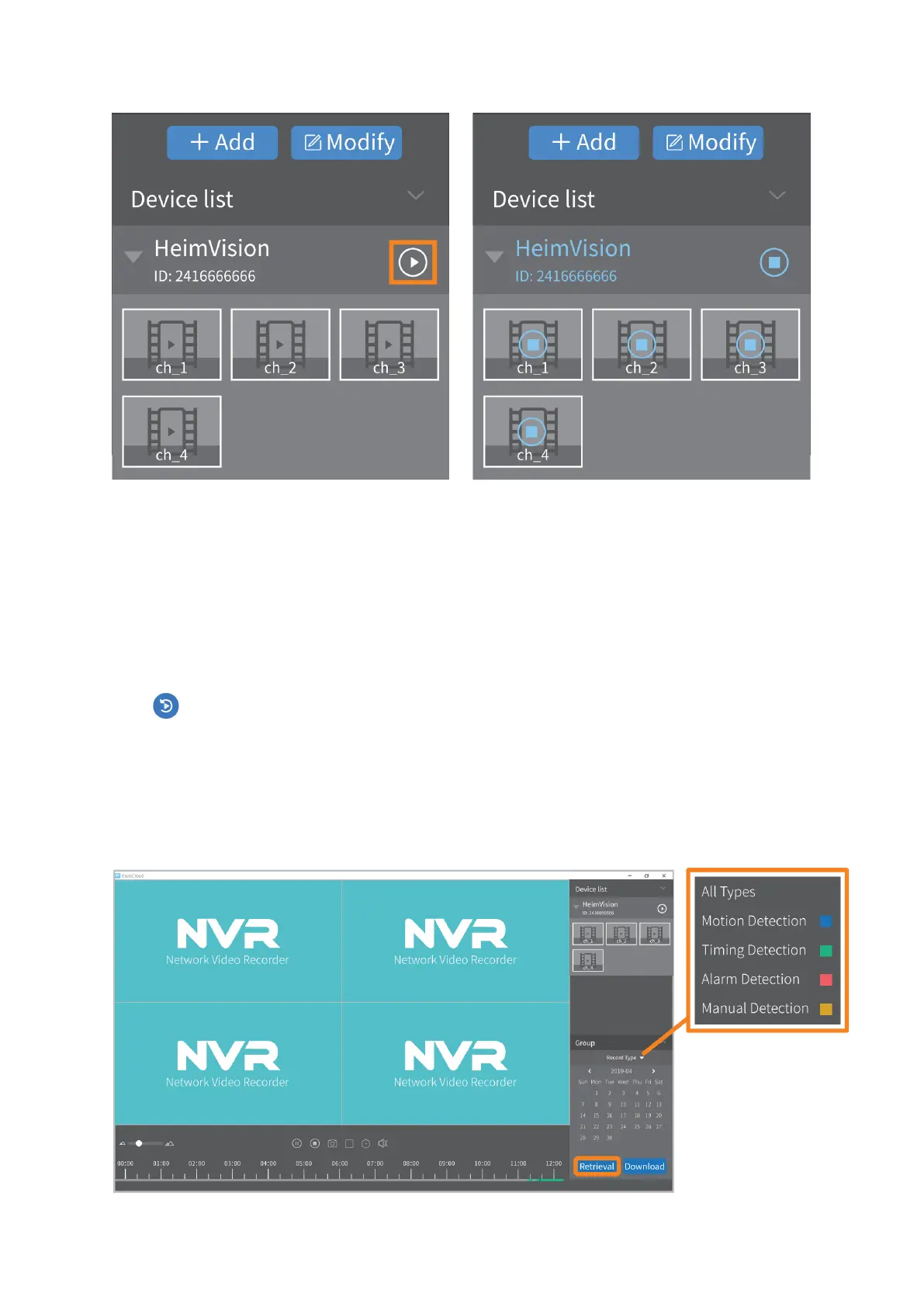 Select Channel, Record type and Date to filter the videos, click Retrieval to display the